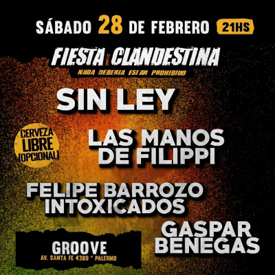 Fiesta Clandestina con Sin Ley + Las Manos de Filippi + Felipe Barrozo + Gaspar Benegas en Palermo Groove