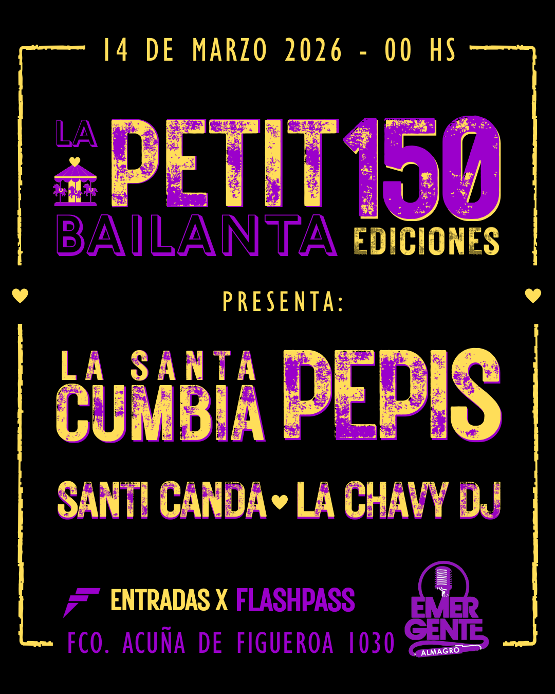Un festejo a lo grande para la bailanta chiquita. Cumplimos 150 ediciones de pura cumbia, y lo festejamos junto a ustedes con La Santa Cumbia, Los Pepis, Cattan & Santi Canda. Garantía de cumbia y amor!